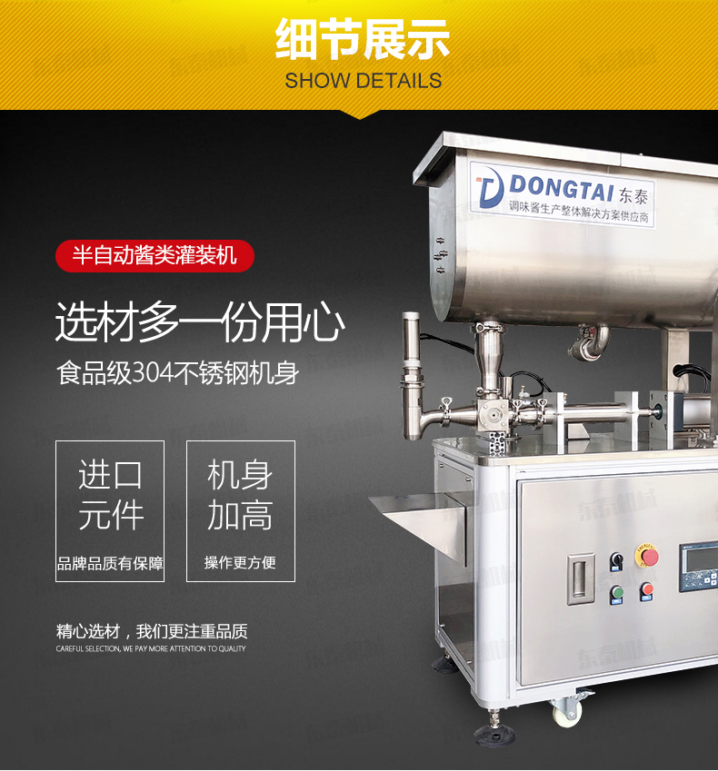 半自動灌裝機(jī)械,配置的自動攪拌器,保證了醬和油的充分混合,可灌裝顆粒漿狀流體物料在對辣椒醬、拌面醬、豆鼓等醬類進(jìn)行灌裝時,灌裝量可在規(guī)定范圍內(nèi)任意調(diào)節(jié),計(jì)量誤差小,該半自動醬類灌裝機(jī)采用壓縮空氣為動力可在各種環(huán)境中使用。