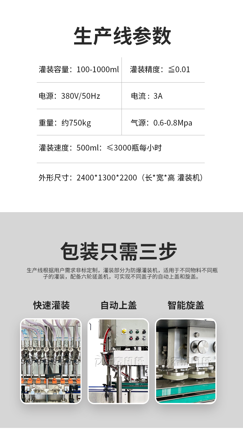 電子量杯感應(yīng)直列式灌裝機,是目前國內(nèi)液體灌裝的高端產(chǎn)品,自動化程度高,灌裝計量精確,適用于塑料瓶、玻璃瓶等各種幾何形狀的瓶型的不含氣體的酒水、飲料、調(diào)味品及其他溶液的定量灌裝。機器采用觸摸屏代替?zhèn)鹘y(tǒng)的按鈕操作,操作簡單、方便、直觀。科技含量高。機器灌裝計量可通過觸摸屏對灌裝時間的調(diào)整實現(xiàn)不同計量灌裝,方便操作者使用。