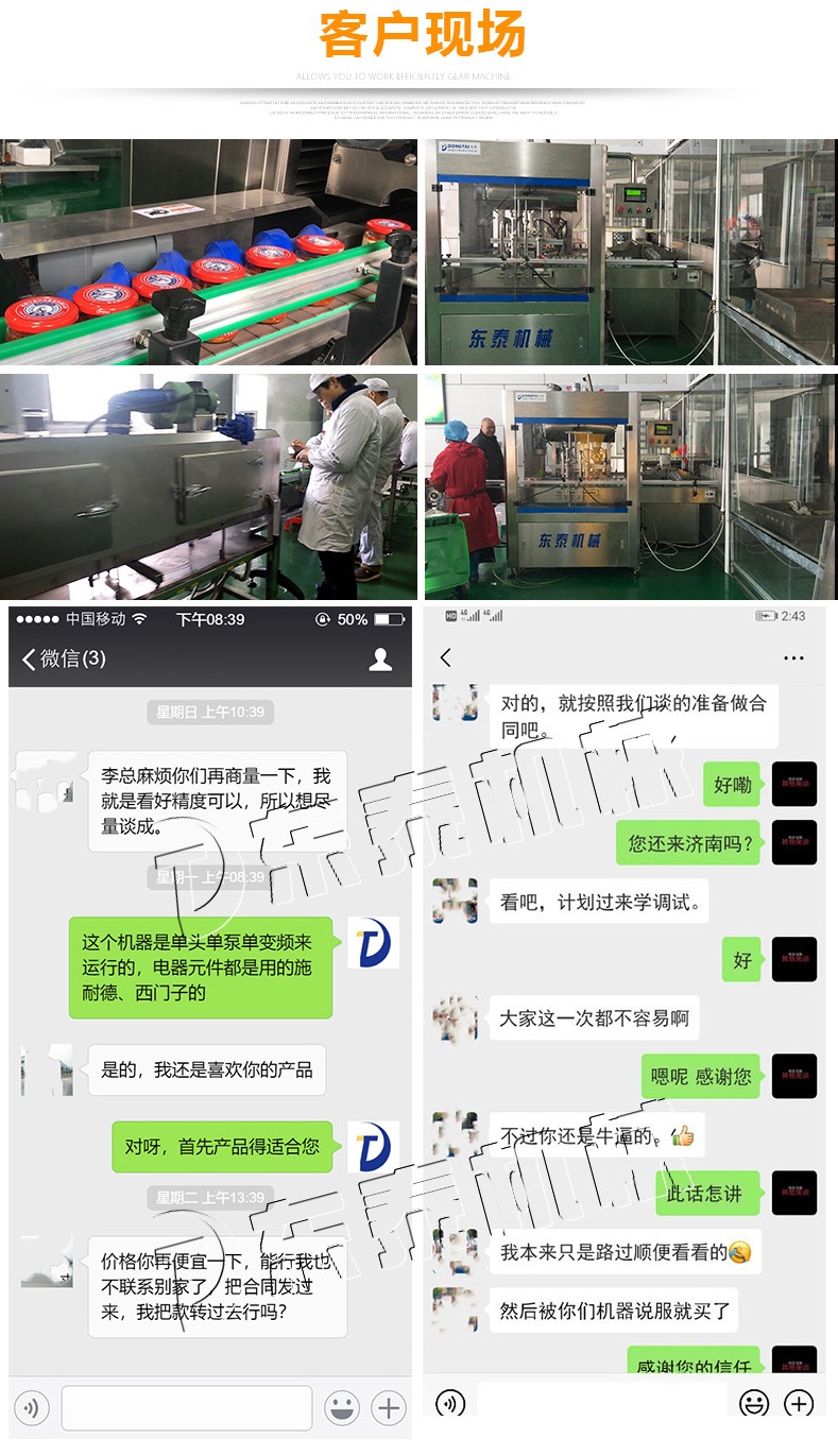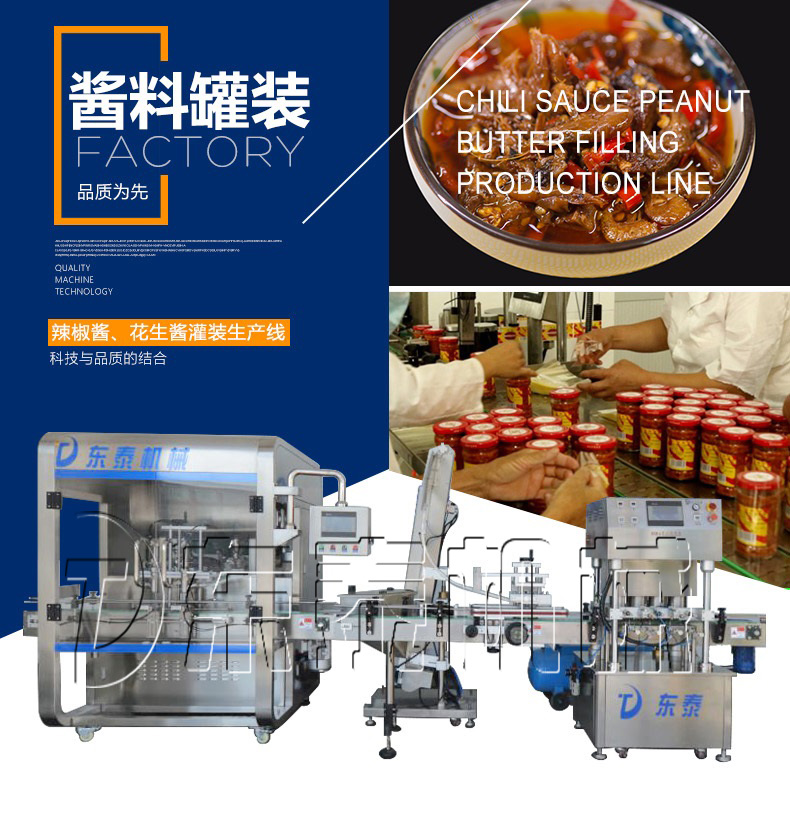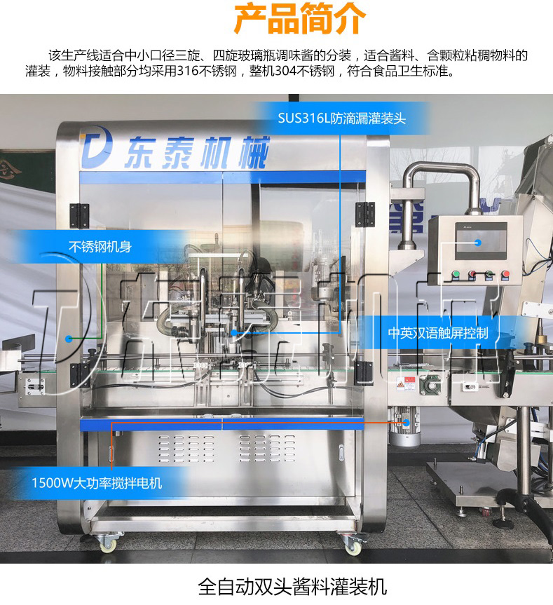 該生產線適合中小口徑三旋、四旋玻璃瓶調味醬的分裝,適合醬料、含顆粒黏稠物料的灌裝,物料接觸部分均采用316不銹鋼,整機304不銹鋼,符合食品衛(wèi)生標準。該機設計合理,機型小巧,立式結構,節(jié)省場地,操作方便。啟動部分均采用德國FESTO和臺灣AirTack的氣動元件。灌裝閥有氣動閥控制,灌裝精度更高,灌裝量和灌裝速度均可任意調整,灌裝悶頭采用防拉絲及升降灌裝裝置。