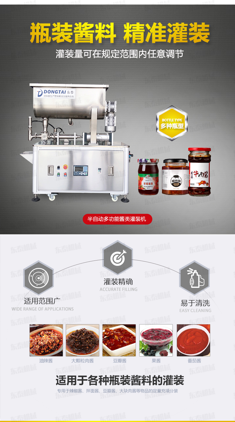 半自動灌裝機(jī)械,配置的自動攪拌器,保證了醬和油的充分混合,可灌裝顆粒漿狀流體物料在對辣椒醬、拌面醬、豆鼓等醬類進(jìn)行灌裝時,灌裝量可在規(guī)定范圍內(nèi)任意調(diào)節(jié),計(jì)量誤差小,該半自動醬類灌裝機(jī)采用壓縮空氣為動力可在各種環(huán)境中使用。