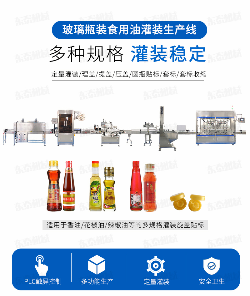 該系列灌裝機(jī)采用容積式計(jì)量灌裝原理,適用于各種規(guī)(100ml-1000ml)的南瓜籽油、榛子油、牡丹籽油、芝麻油、核桃油、山茶油、亞麻籽油、棉籽油、橄欖油、大豆油、玉米油、菜籽油等食用油灌裝。設(shè)備采用伺服驅(qū)動(dòng)活塞計(jì)量,保證了 1‰的灌裝精度,在保證灌裝精度的同時(shí),提高了 20%-35%灌裝速度,操作簡(jiǎn)單,維護(hù)方便,節(jié)省人工成本,生產(chǎn)效率更高。