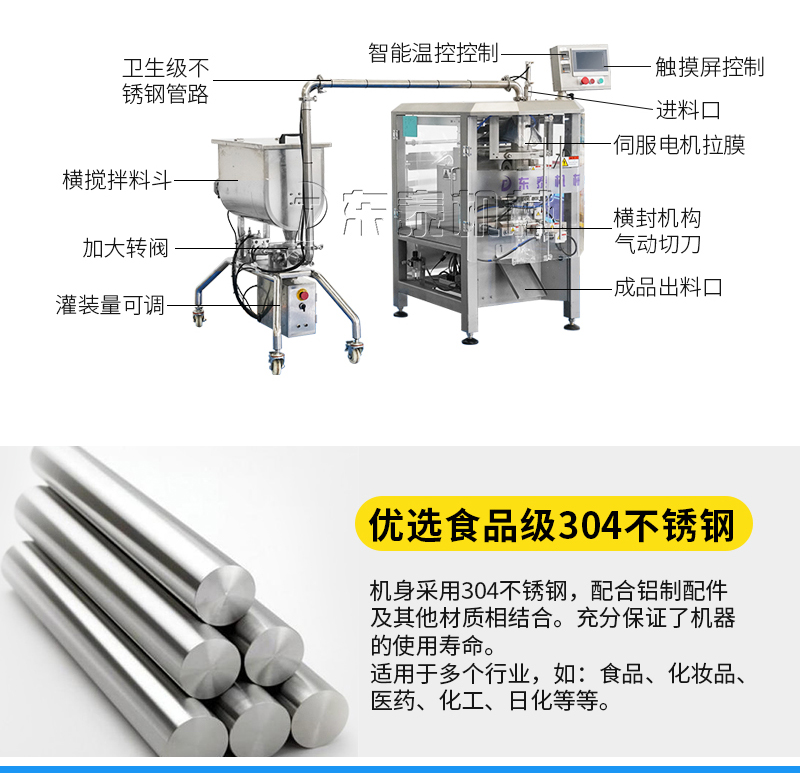 本機(jī)器主要用于調(diào)味品醬料的自動(dòng)化包裝,機(jī)器安裝有橫向螺帶式攪拌,使油醬混合均勻,確保灌裝精度和產(chǎn)品包裝成品的均勻性。灌裝計(jì)量設(shè)備安裝有萬(wàn)向輪,管路鏈接均采用快拆接頭,方便灌裝機(jī)拆卸移動(dòng)清洗。包裝設(shè)備采用全伺服驅(qū)動(dòng)器,包裝速度快,運(yùn)行穩(wěn)定。