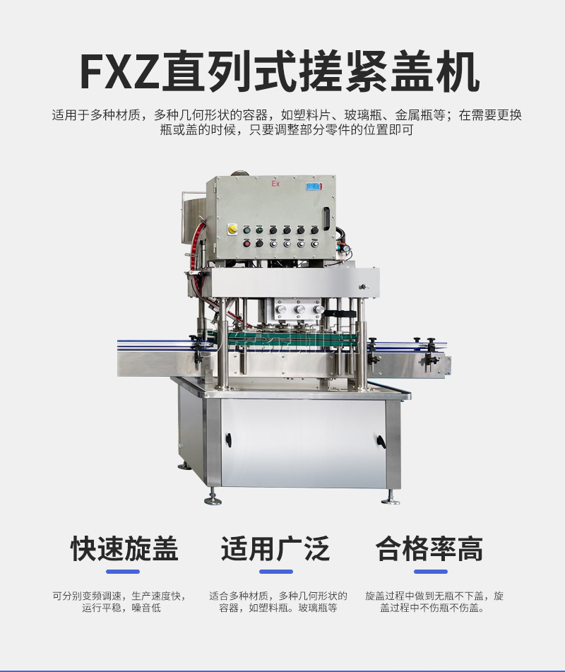 本機適用于多種材質(zhì),多種幾何形狀的容器,如塑料片、玻璃瓶、金屬瓶等;在需要更換瓶或蓋的時候,只要調(diào)整部分零件的位置即可,無需更換任何配件;在旋蓋過程中可以做到無瓶不下蓋。理蓋器、輸送機、旋蓋機、夾瓶皮帶速度可分別變頻調(diào)速,適應(yīng)在規(guī)定范圍內(nèi)的各類規(guī)格的旋蓋。(附:特殊規(guī)格定制即可)