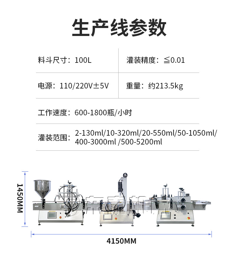 產(chǎn)品說明:生產(chǎn)線根據(jù)灌裝范圍選擇型號,灌裝部分為雙頭下潛式灌裝機,適用于不同物料不同瓶子的灌裝,配備自動壓蓋機和圓瓶貼標(biāo)機,可實現(xiàn)不同蓋子的旋蓋貼標(biāo)工作。